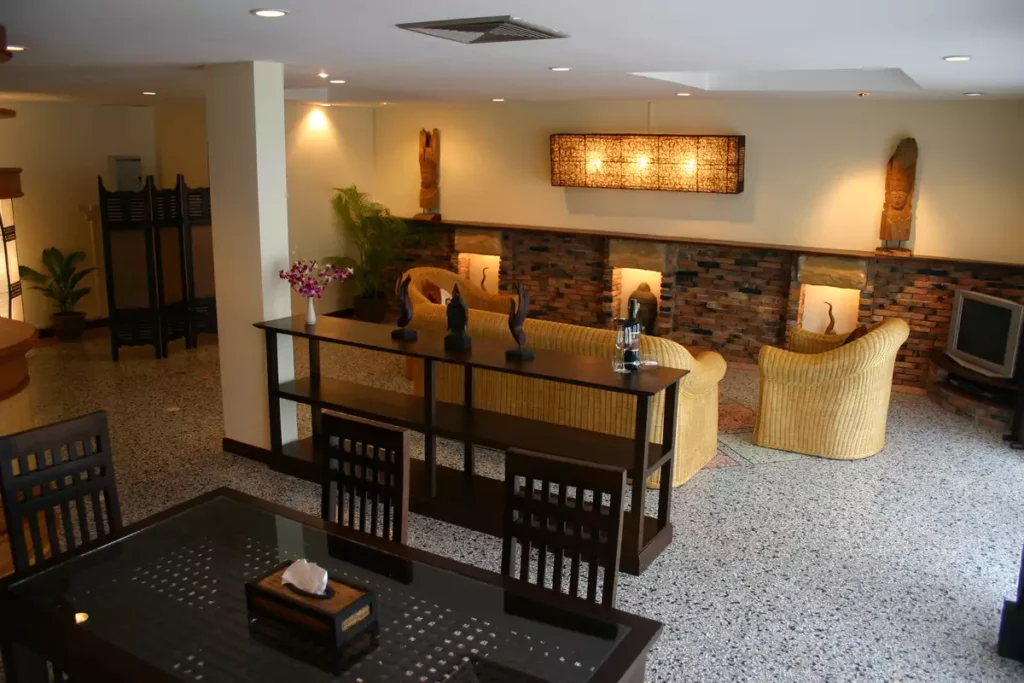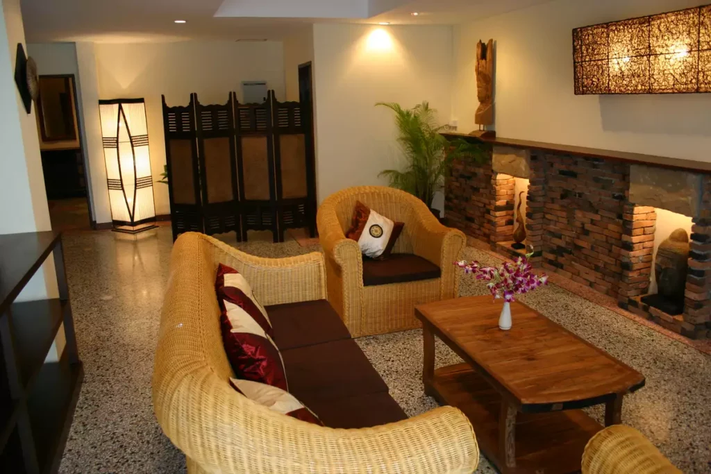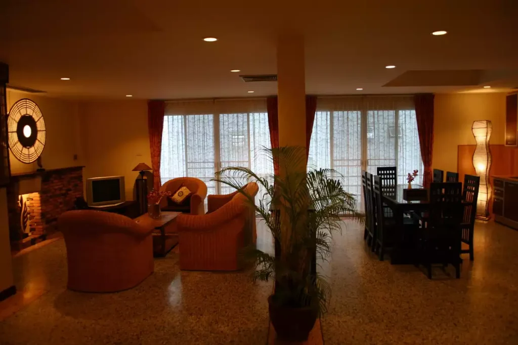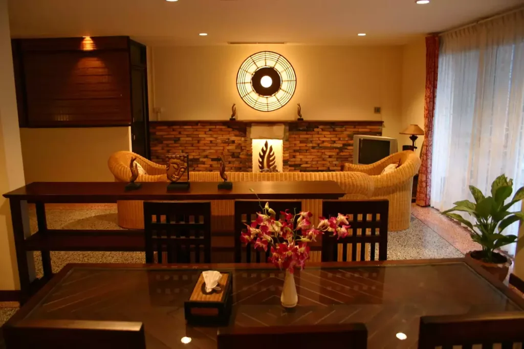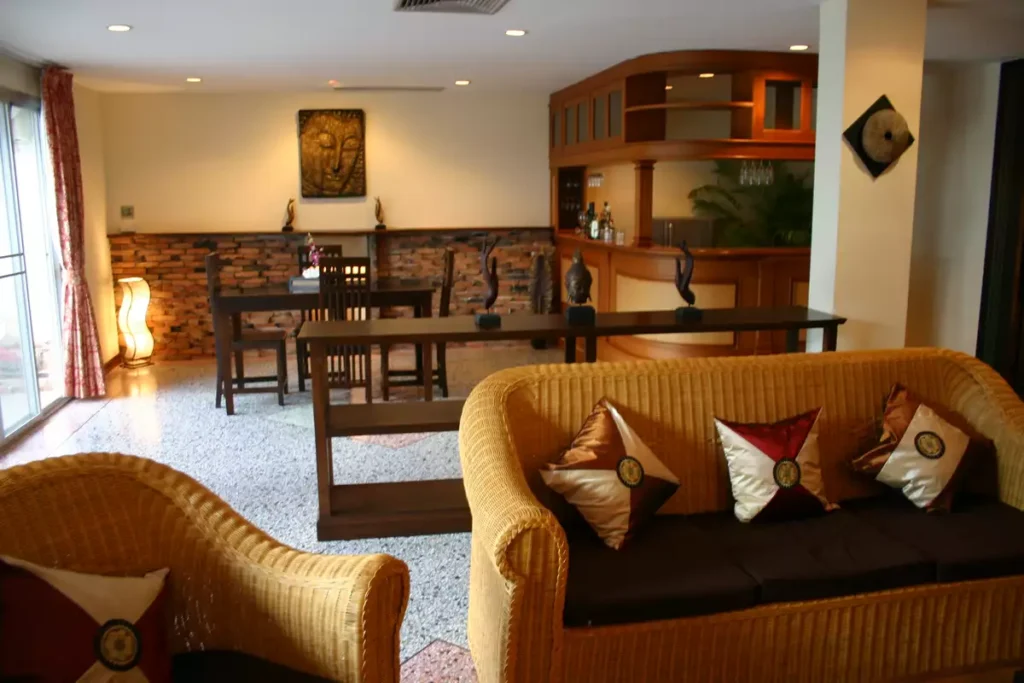 Stairs leading up to the 2nd floor come out into another spacious, stylish decorated living-room with TV and DVD player, rattan sofa-set, dining table and chairs, full size bar and a guest toilet.