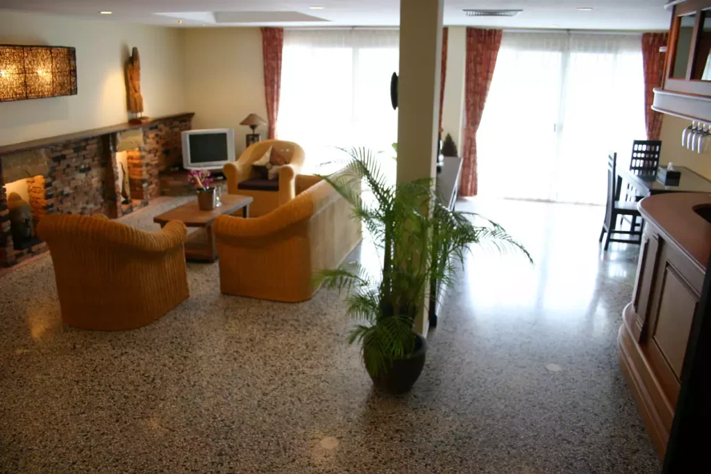 On the 1st floor there is the first of two spacious, open-plan living-rooms (80sq.m), and a fully equipped kitchen and dining area. The computer corner, with high speed internet connection, is also located here. This can be used unlimited and free of charge by the guests during their stay. There is also a TV and DVD player with sofas. The living room opens out onto a large balcony that runs the entire width of the building. The view from this terrace is of a neighbouring building.